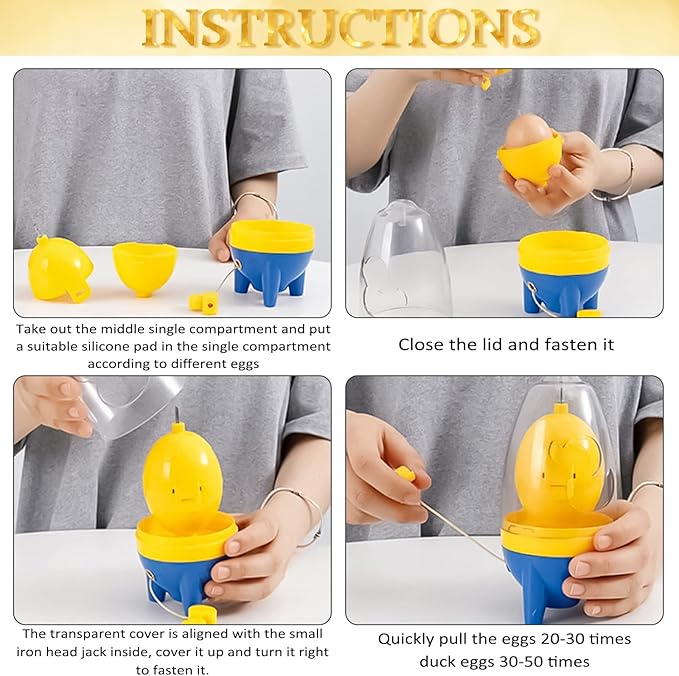 The Cyclone Golden Egg spinner lets you create yolk-mixed golden eggs without cracking the shell. Using centrifugal force, it evenly blends yolk and white inside the egg. Just boil after spinning for a delicious, mess-free golden egg. Fun, safe, and easy to use—perfect for kids and adults alike.